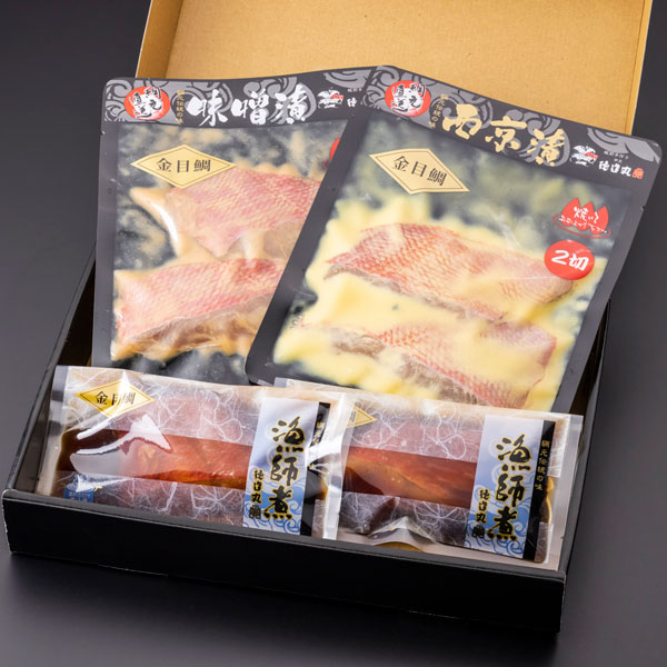 【商品内容】金目鯛漁師煮2切、金目鯛西京漬2切、金目鯛味噌漬2切